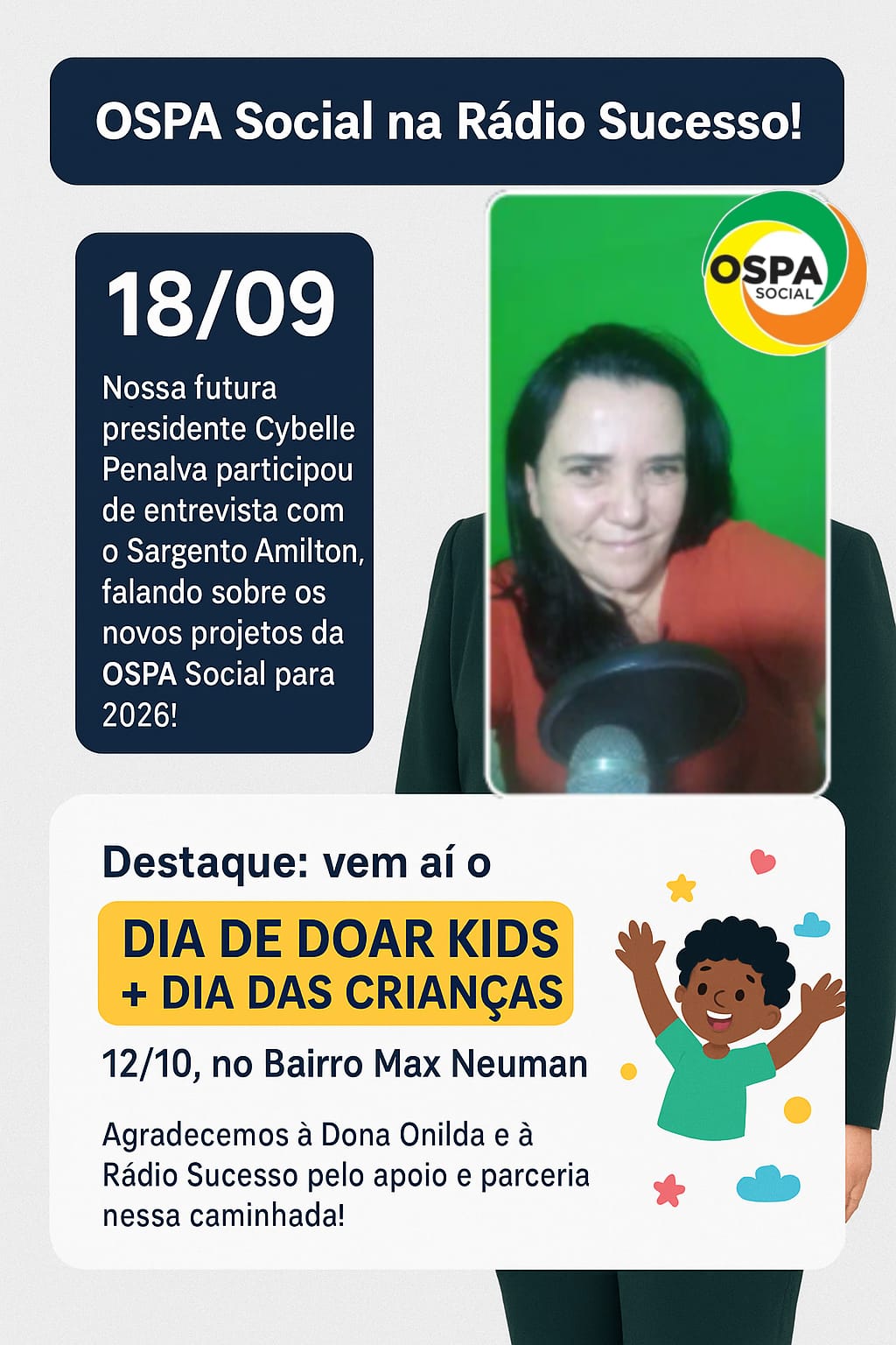A OSPA Social agradece à Dona Onilda pelo espaço cedido na Rádio Sucesso, parceira importante na divulgação das ações que têm transformado a realidade das famílias em Araxá.